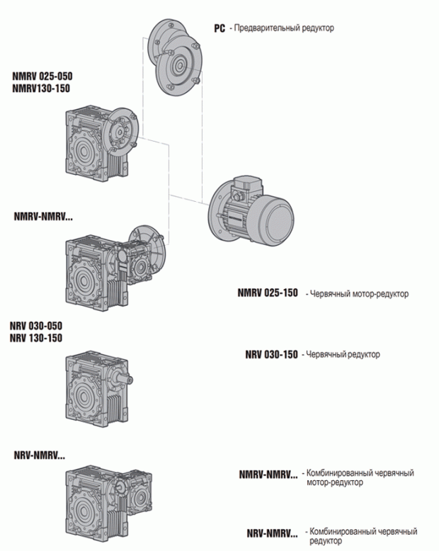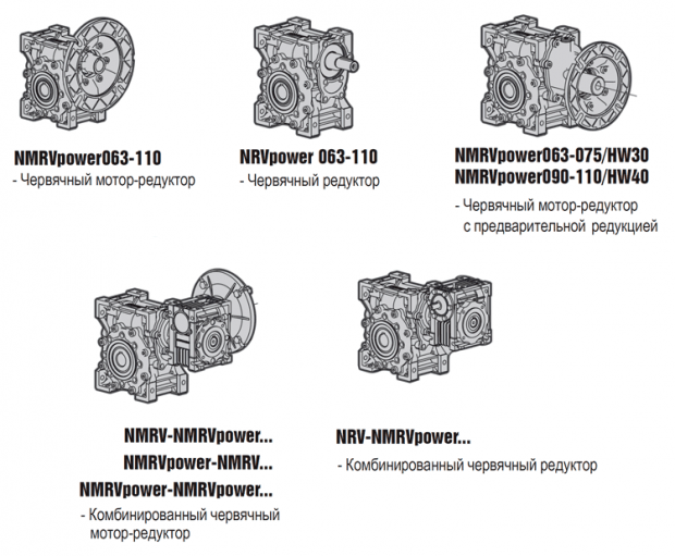 Редукторы поставляются с различными комбинациями: NMRV+NMRV, NMRVpower+NMRV, NRV+NMRV, NRVpower+NMRV, PC+NMRV, HW/NMRVpower, IHW/NMRVpower.